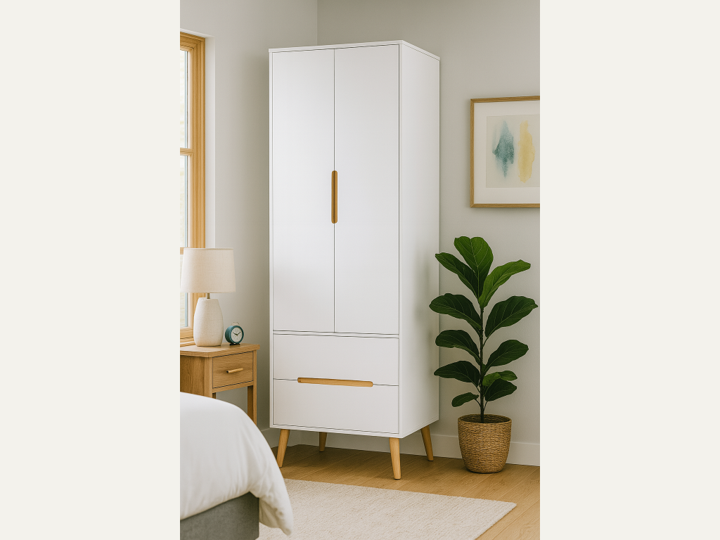 The Alicia Combination wardrobe blends retro charm with modern sophistication, featuring a pristine matt white lacquered finish and tapered oak legs. Two spacious drawers with recessed handles offer seamless access, while its sleek Scandinavian design complements any interior with understated elegance and timeless style.